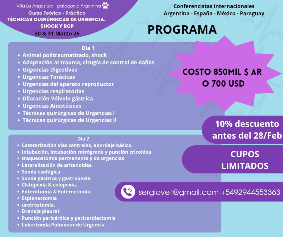 Le compartimos información del Curso Teórico – Práctico de “Técnicas Quirúrgicas de urgencia, shock y RCP”. El mismo tendrá lugar los días 30 y 31 de marzo de 2026, en Villa La Angostura – Patagonia Argentina.
