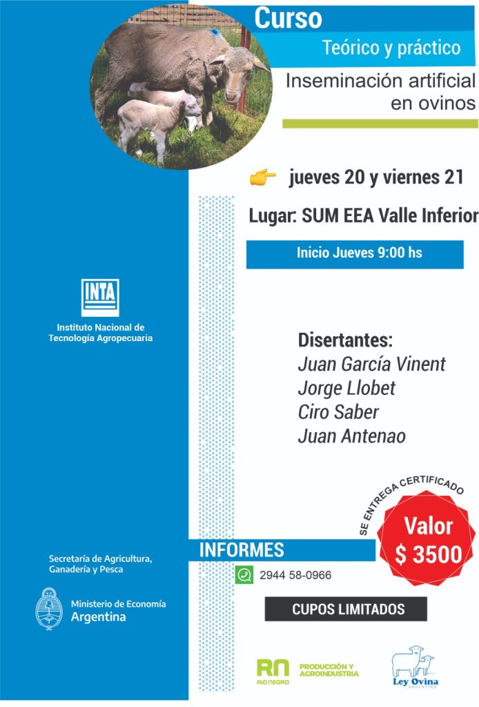 El Instituto Nacional de Tecnología Agropecuaria, INTA, invita a nuevo curso de capacitación. En este caso, presenta el Curso de Inseminación Artificial en Ovinos junto con el Ministerio de Producción y Agroindustria de la provincia de Río Negro y el programa Ley Ovina.